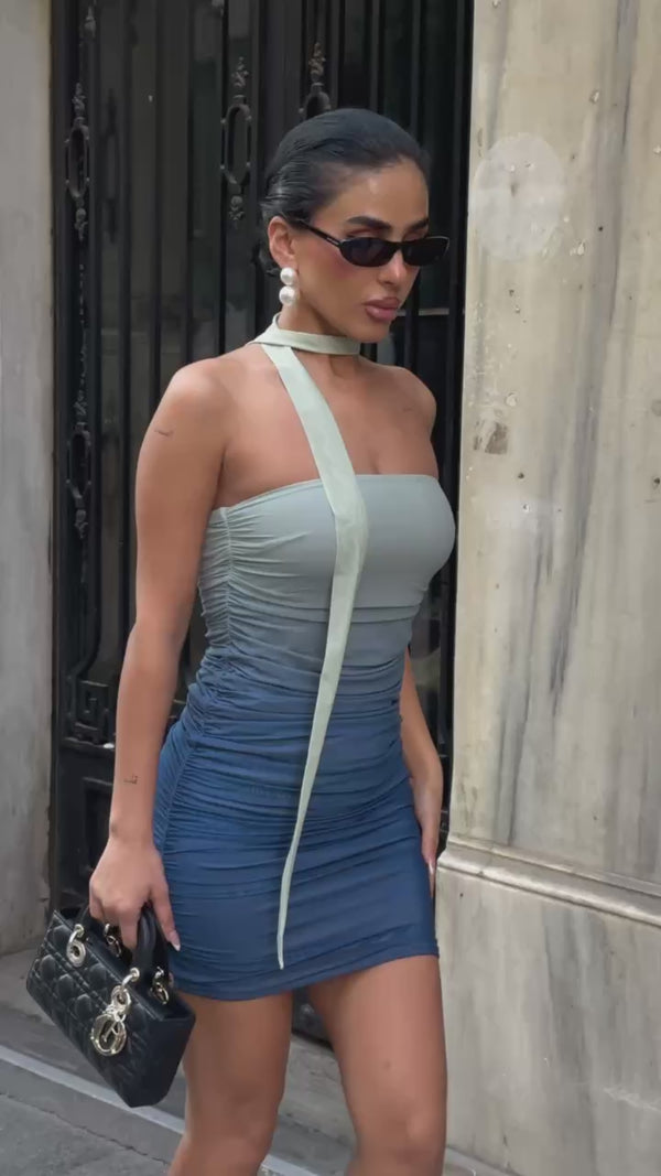 Design & Features: The Ethereal Glow Mini Dress brings effortless glamour with its dreamy ombré tones and ruched bodycon design. This strapless dress features a delicate neck scarf tie that drapes elegantly down the back, adding a hint of sophistication. Designed to hug curves while allowing easy movement, it creates a chic and confident silhouette perfect for standout moments.