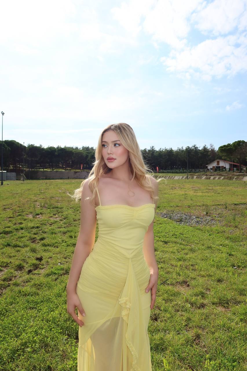 The Ethereal Grace Maxi Dress offers a body-skimming fit through the bodice with a softly flared, airy finish. The layered mesh and ruffle draping create texture and flow, balancing sensuality with timeless elegance.