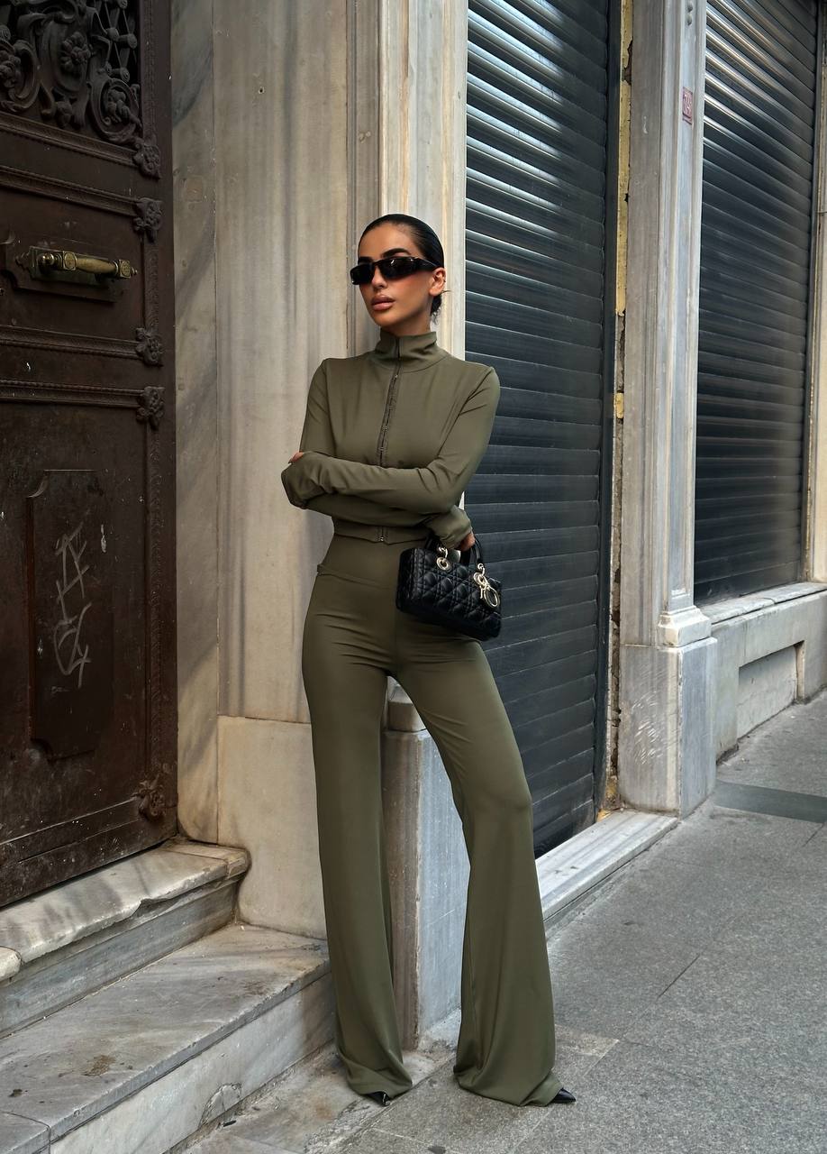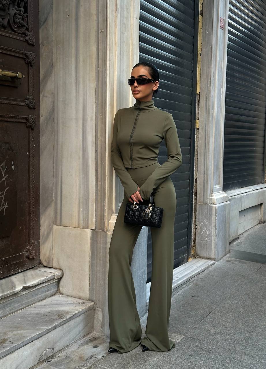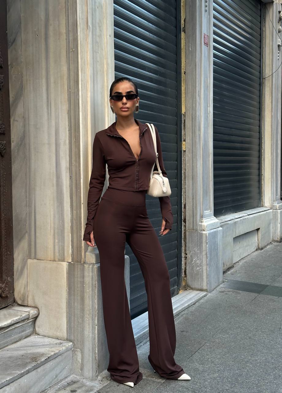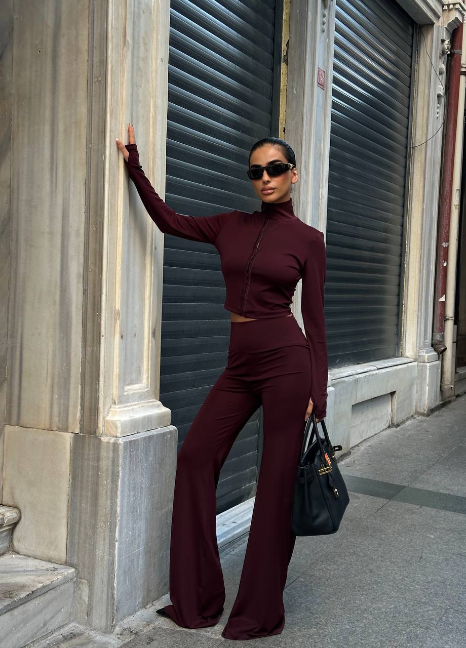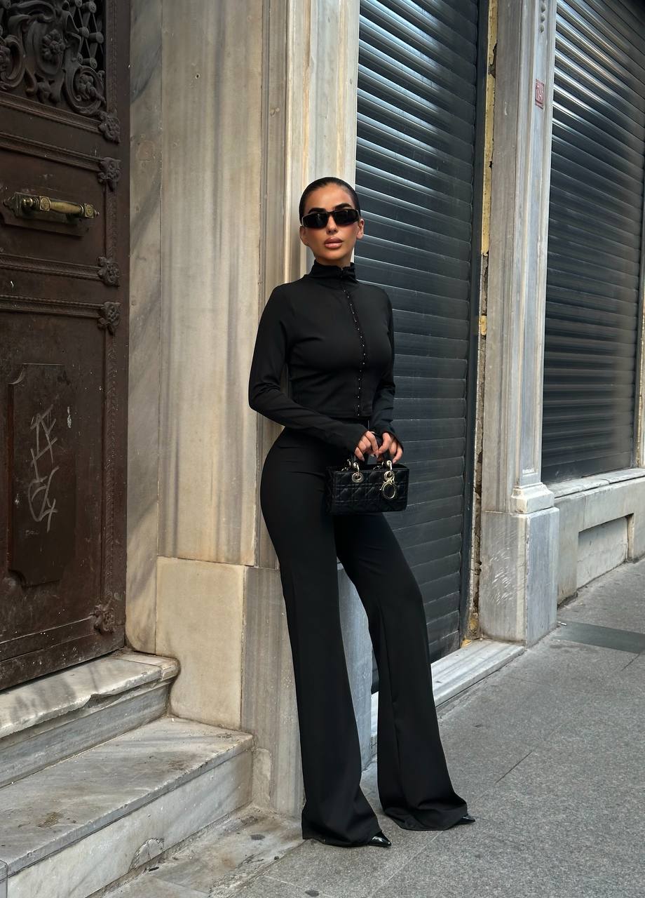 Fit & Style: Form-fitting top enhances curves, while the flared trousers create a balanced, elongated look. Designed for a clean, seamless aesthetic — effortlessly styled with heels or boots for a refined appearance.