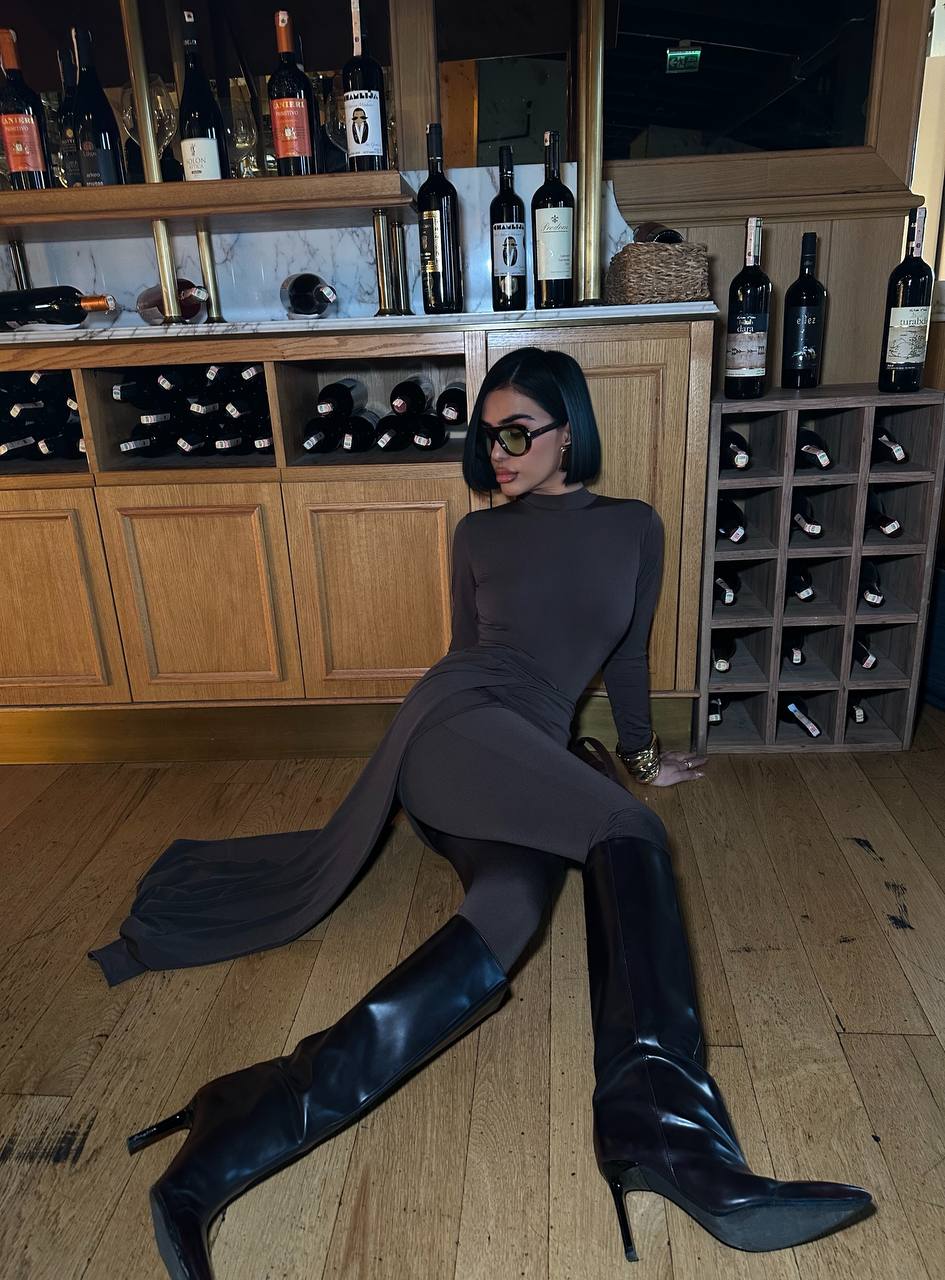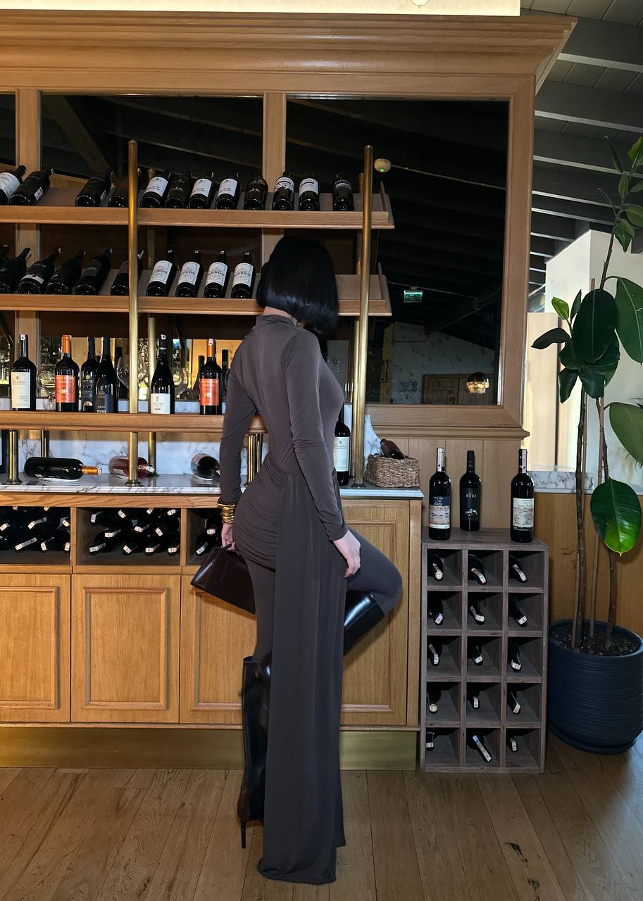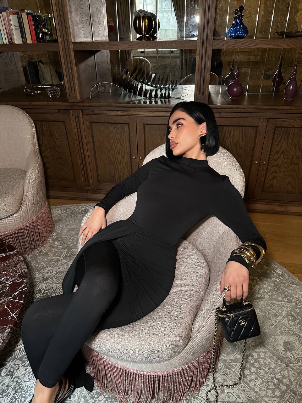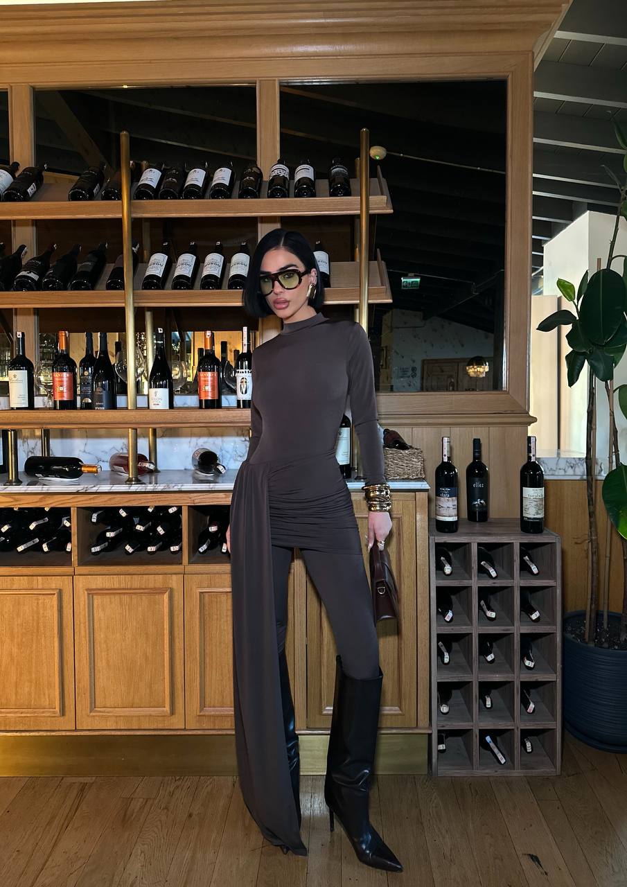 Design & Features: The Midnight Muse Maxi Dress features a sleek, minimalist silhouette with a high neckline and long fitted sleeves for a refined, modern look. The standout detail is the softly draped front panel that flows from the waist, creating movement and an elongating effect. Clean lines and a sculpted fit give this dress a confident, fashion-forward presence suitable for elevated styling.