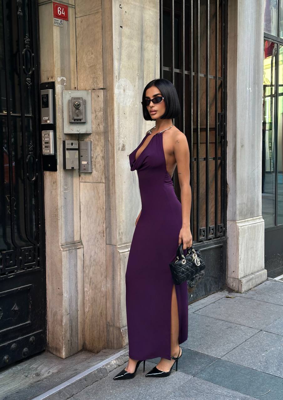 Fit & Style: Slim-fit design with a halter neck and open back, providing a modern yet timeless look. A side slit adds freedom of movement and elegance.