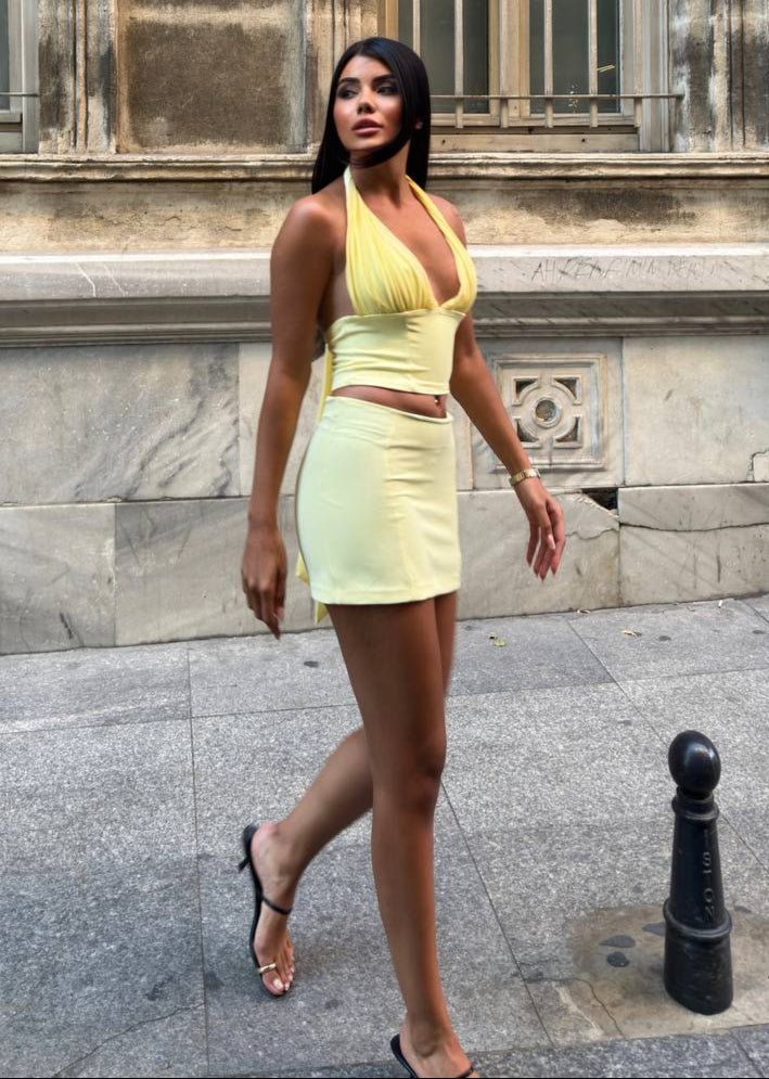 The Soleil Two-Piece Halter Mini Set is your new go-to look for sun-soaked days and electric nights. Featuring a deep-plunge halter neck crop top with a long flowing tie-back, paired with a body-hugging high-rise mini skirt, this set balances boldness with soft elegance. The top’s ruched detailing adds texture, while the ultra-mini skirt keeps it flirty and fresh. Comes in classic black, soft butter yellow, and breezy sky blue.