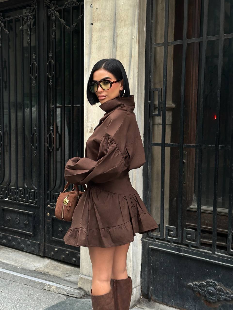 Design & Features: The Urban Muse Mini Dress features a refined shirt-style neckline paired with softly voluminous long sleeves for a bold yet elegant silhouette. A structured high-waist corset panel with covered button detailing defines the waist, while the softly ruffled mini skirt adds movement and a playful finish. The tailored upper meets a flowing lower hem for a perfectly balanced look that feels polished and fashion-forward.