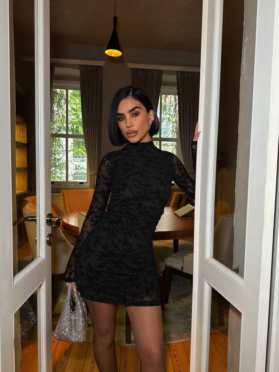 Design & Features: The Velvet Muse Mini Dress features a sleek bodycon silhouette with a refined high neckline and long sheer lace sleeves. The delicate floral lace overlay adds texture and depth, while the fitted cut highlights the natural shape for a confident, polished look. Minimal yet striking, this dress balances elegance with modern sensuality.